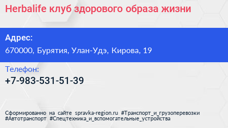 Herbalife, клуб здорового образа жизни по адресу 670000, Бурятия, Улан-Удэ, Кирова, 19 в дальнейшем Организация, размещена в следующих категориях: