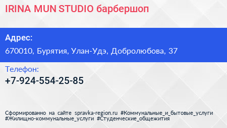 IRINA MUN STUDIO, барбершоп по адресу 670010, Бурятия, Улан-Удэ, Добролюбова, 37 в дальнейшем Организация, размещена в следующих категориях: