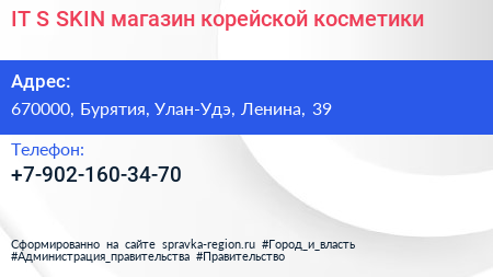 IT`S SKIN, магазин корейской косметики по адресу 670000, Бурятия, Улан-Удэ, Ленина, 39 в дальнейшем Организация, размещена в следующих категориях: