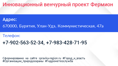 Инновационный венчурный проект Фермион по адресу 670000, Бурятия, Улан-Удэ, Коммунистическая, 47а в дальнейшем Организация, размещена в следующих категориях: