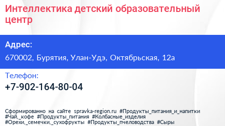 Интеллектика, детский образовательный центр по адресу 670002, Бурятия, Улан-Удэ, Октябрьская, 12а в дальнейшем Организация, размещена в следующих категориях: