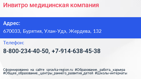 Инвитро, медицинская компания по адресу 670033, Бурятия, Улан-Удэ, Жердева, 132 в дальнейшем Организация, размещена в следующих категориях:
