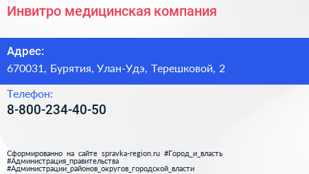Инвитро, медицинская компания по адресу 670031, Бурятия, Улан-Удэ, Терешковой, 2 в дальнейшем Организация, размещена в следующих категориях: