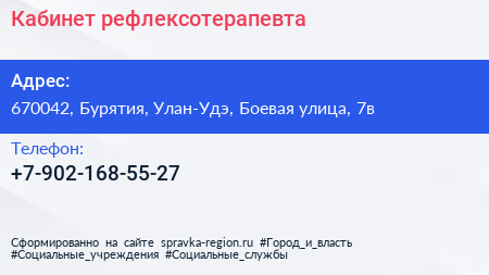 Кабинет рефлексотерапевта по адресу 670042, Бурятия, Улан-Удэ, Боевая улица, 7в в дальнейшем Организация, размещена в следующих категориях:
