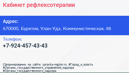 Кабинет рефлексотерапии по адресу 670000, Бурятия, Улан-Удэ, Коммунистическая, 48 в дальнейшем Организация, размещена в следующих категориях: