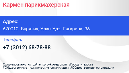 Кармен, парикмахерская по адресу 670010, Бурятия, Улан-Удэ, Гагарина, 36 в дальнейшем Организация, размещена в следующих категориях: