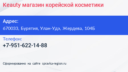 Keauty, магазин корейской косметики по адресу 670033, Бурятия, Улан-Удэ, Жердева, 104Б в дальнейшем Организация, размещена в следующих категориях:
