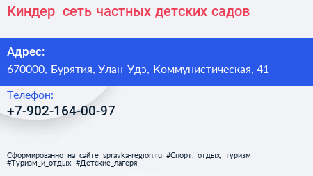 Киндер+, сеть частных детских садов по адресу 670000, Бурятия, Улан-Удэ, Коммунистическая, 41 в дальнейшем Организация, размещена в следующих категориях: