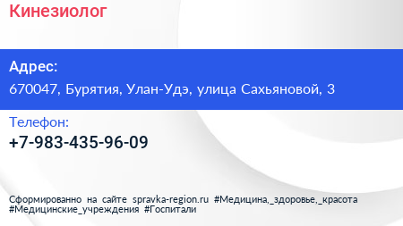 Кинезиолог по адресу 670047, Бурятия, Улан-Удэ, улица Сахьяновой, 3 в дальнейшем Организация, размещена в следующих категориях: