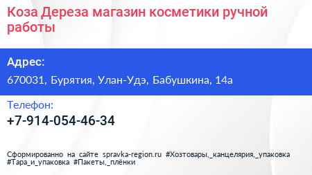 Коза-Дереза, магазин косметики ручной работы по адресу 670031, Бурятия, Улан-Удэ, Бабушкина, 14а в дальнейшем Организация, размещена в следующих категориях: