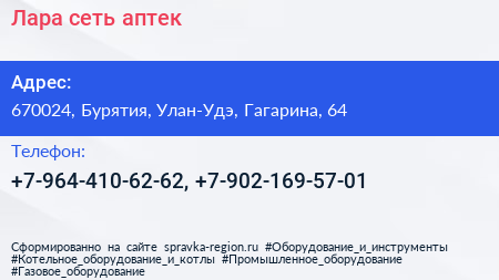Лара, сеть аптек по адресу 670024, Бурятия, Улан-Удэ, Гагарина, 64 в дальнейшем Организация, размещена в следующих категориях: