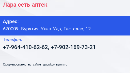Лара, сеть аптек по адресу 670009, Бурятия, Улан-Удэ, Гастелло, 12 в дальнейшем Организация, размещена в следующих категориях: