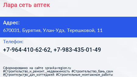 Лара, сеть аптек по адресу 670031, Бурятия, Улан-Удэ, Терешковой, 11 в дальнейшем Организация, размещена в следующих категориях: