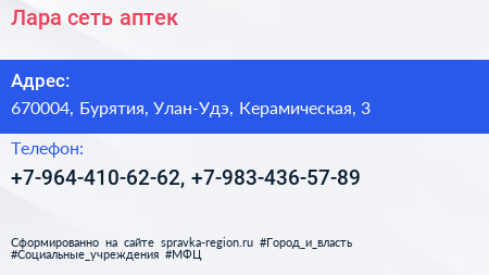 Лара, сеть аптек по адресу 670004, Бурятия, Улан-Удэ, Керамическая, 3 в дальнейшем Организация, размещена в следующих категориях:
