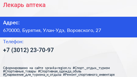 Лекарь, аптека по адресу 670000, Бурятия, Улан-Удэ, Воровского, 27 в дальнейшем Организация, размещена в следующих категориях: