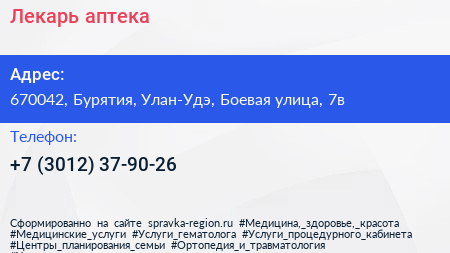 Лекарь, аптека по адресу 670042, Бурятия, Улан-Удэ, Боевая улица, 7в в дальнейшем Организация, размещена в следующих категориях: