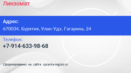 Линзомат по адресу 670034, Бурятия, Улан-Удэ, Гагарина, 24 в дальнейшем Организация, размещена в следующих категориях: