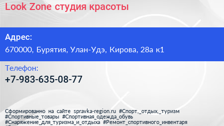 Look Zone, студия красоты по адресу 670000, Бурятия, Улан-Удэ, Кирова, 28а к1 в дальнейшем Организация, размещена в следующих категориях: