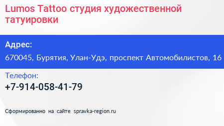 Lumos Tattoo, студия художественной татуировки по адресу 670045, Бурятия, Улан-Удэ, проспект Автомобилистов, 16 в дальнейшем Организация, размещена в следующих категориях:
