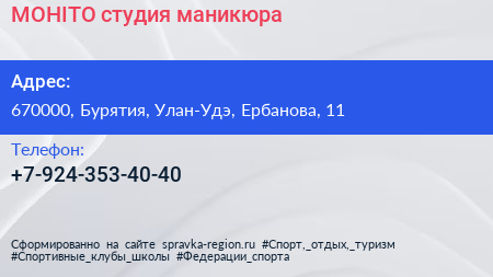MOHITO, студия маникюра по адресу 670000, Бурятия, Улан-Удэ, Ербанова, 11 в дальнейшем Организация, размещена в следующих категориях: