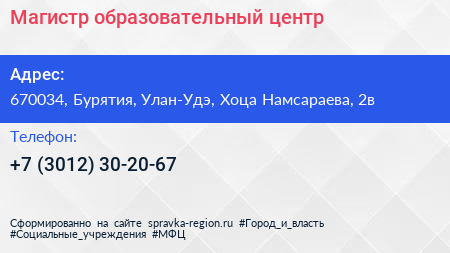 Магистр, образовательный центр по адресу 670034, Бурятия, Улан-Удэ, Хоца Намсараева, 2в в дальнейшем Организация, размещена в следующих категориях: