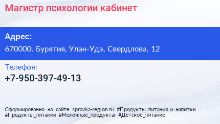 Магистр психологии, кабинет по адресу 670000, Бурятия, Улан-Удэ, Свердлова, 12 в дальнейшем Организация, размещена в следующих категориях: