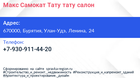 Макс Самокат Тату, тату-салон по адресу 670000, Бурятия, Улан-Удэ, Ленина, 24 в дальнейшем Организация, размещена в следующих категориях: