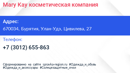 Mary Kay, косметическая компания по адресу 670034, Бурятия, Улан-Удэ, Цивилева, 27 в дальнейшем Организация, размещена в следующих категориях: