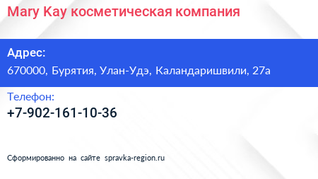 Mary Kay, косметическая компания по адресу 670000, Бурятия, Улан-Удэ, Каландаришвили, 27а в дальнейшем Организация, размещена в следующих категориях: