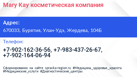 Mary Kay, косметическая компания по адресу 670033, Бурятия, Улан-Удэ, Жердева, 104Б в дальнейшем Организация, размещена в следующих категориях: