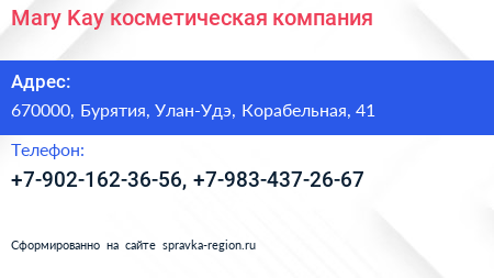 Mary Kay, косметическая компания по адресу 670000, Бурятия, Улан-Удэ, Корабельная, 41 в дальнейшем Организация, размещена в следующих категориях: