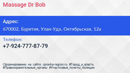 Massage Dr. Bob по адресу 670002, Бурятия, Улан-Удэ, Октябрьская, 12а в дальнейшем Организация, размещена в следующих категориях: