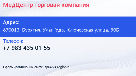 МедЦентр, торговая компания по адресу 670013, Бурятия, Улан-Удэ, Ключевская улица, 90Б в дальнейшем Организация, размещена в следующих категориях: