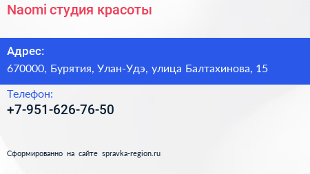 Naomi, студия красоты по адресу 670000, Бурятия, Улан-Удэ, улица Балтахинова, 15 в дальнейшем Организация, размещена в следующих категориях: