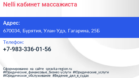 Nelli, кабинет массажиста по адресу 670034, Бурятия, Улан-Удэ, Гагарина, 25Б в дальнейшем Организация, размещена в следующих категориях:
