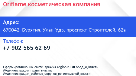 Oriflame, косметическая компания по адресу 670042, Бурятия, Улан-Удэ, проспект Строителей, 62а в дальнейшем Организация, размещена в следующих категориях:
