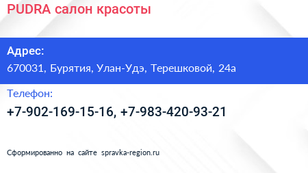 PUDRA, салон красоты по адресу 670031, Бурятия, Улан-Удэ, Терешковой, 24а в дальнейшем Организация, размещена в следующих категориях: