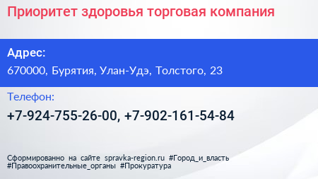 Приоритет здоровья, торговая компания по адресу 670000, Бурятия, Улан-Удэ, Толстого, 23 в дальнейшем Организация, размещена в следующих категориях: