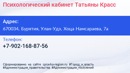 Психологический кабинет Татьяны Красс по адресу 670034, Бурятия, Улан-Удэ, Хоца Намсараева, 7а в дальнейшем Организация, размещена в следующих категориях: