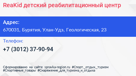 ReaKid, детский реабилитационный центр по адресу 670031, Бурятия, Улан-Удэ, Геологическая, 23 в дальнейшем Организация, размещена в следующих категориях: