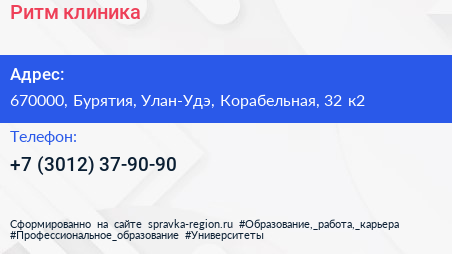 Ритм, клиника по адресу 670000, Бурятия, Улан-Удэ, Корабельная, 32 к2 в дальнейшем Организация, размещена в следующих категориях: