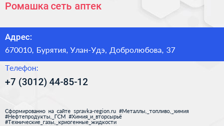 Ромашка, сеть аптек по адресу 670010, Бурятия, Улан-Удэ, Добролюбова, 37 в дальнейшем Организация, размещена в следующих категориях:
