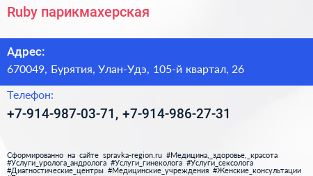 Ruby, парикмахерская по адресу 670049, Бурятия, Улан-Удэ, 105-й квартал, 26 в дальнейшем Организация, размещена в следующих категориях: