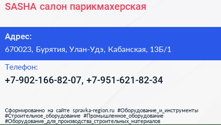 SASHA, салон-парикмахерская по адресу 670023, Бурятия, Улан-Удэ, Кабанская, 13Б/1 в дальнейшем Организация, размещена в следующих категориях: