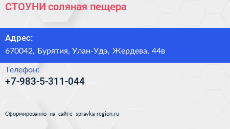 СТОУНИ, соляная пещера по адресу 670042, Бурятия, Улан-Удэ, Жердева, 44в в дальнейшем Организация, размещена в следующих категориях: