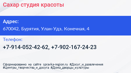 Сахар, студия красоты по адресу 670042, Бурятия, Улан-Удэ, Конечная, 4 в дальнейшем Организация, размещена в следующих категориях: