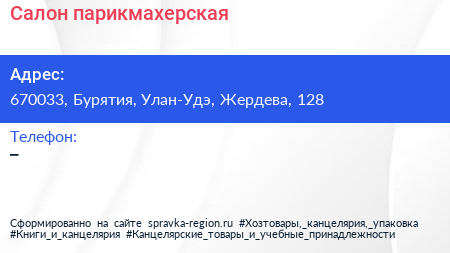 Салон-парикмахерская по адресу 670033, Бурятия, Улан-Удэ, Жердева, 128 в дальнейшем Организация, размещена в следующих категориях: