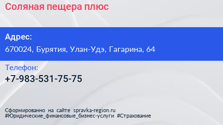 Соляная пещера плюс по адресу 670024, Бурятия, Улан-Удэ, Гагарина, 64 в дальнейшем Организация, размещена в следующих категориях:
