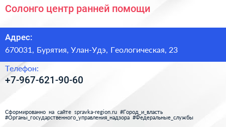 Солонго, центр ранней помощи по адресу 670031, Бурятия, Улан-Удэ, Геологическая, 23 в дальнейшем Организация, размещена в следующих категориях: