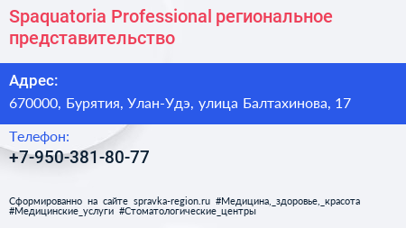 Spaquatoria Professional, региональное представительство по адресу 670000, Бурятия, Улан-Удэ, улица Балтахинова, 17 в дальнейшем Организация, размещена в следующих категориях:
